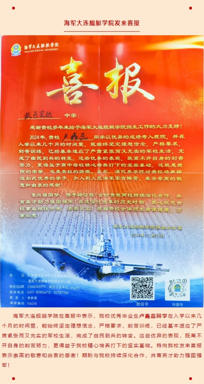 近(jìn)日(rì),西(xī)北(běi)農(nóng)林(lín)科(kē)技(jì)大(dà)學、海(hǎi)軍大(dà)連艦艇學院向我校(xiào)發來σ(lái)喜報(bào),感謝(xiè)我校(xiào)多(duō)年(nián)來(lái)為(wèi)西(xī)北(běi)農(nóng)林(lín)科(kē)技(≤jì)大(dà)學、海(hǎi)軍大(dà)連艦艇學院輸送了(le)大(dà)批品學兼優的(de)學子(zǐ)。